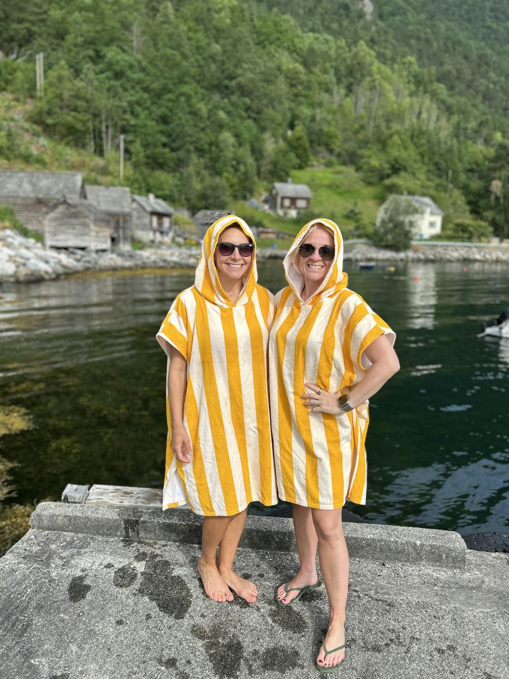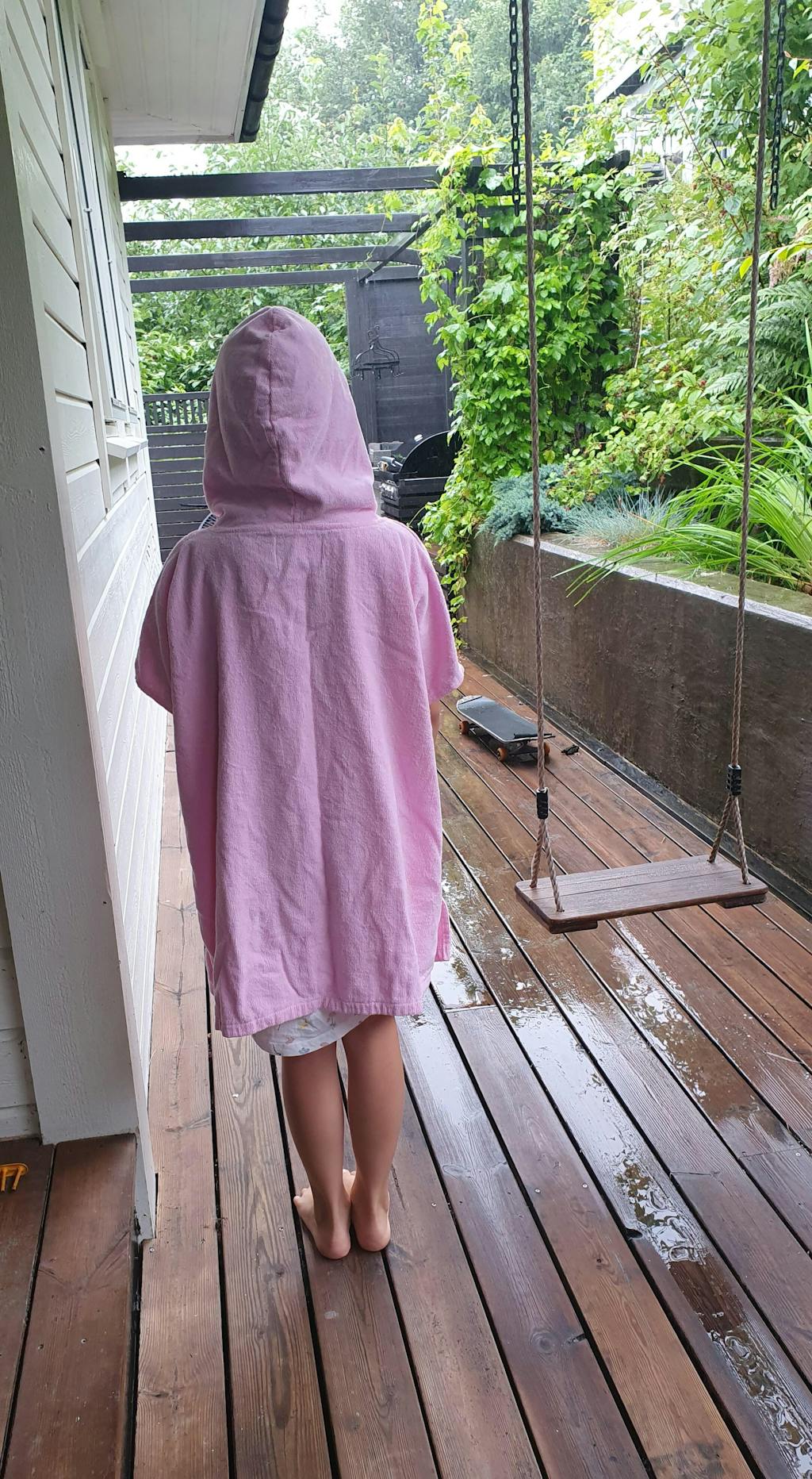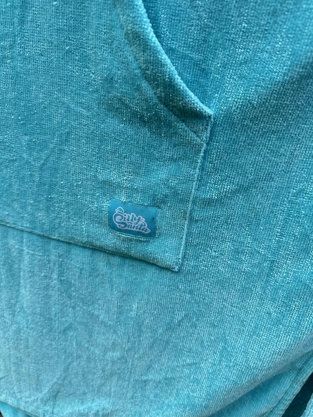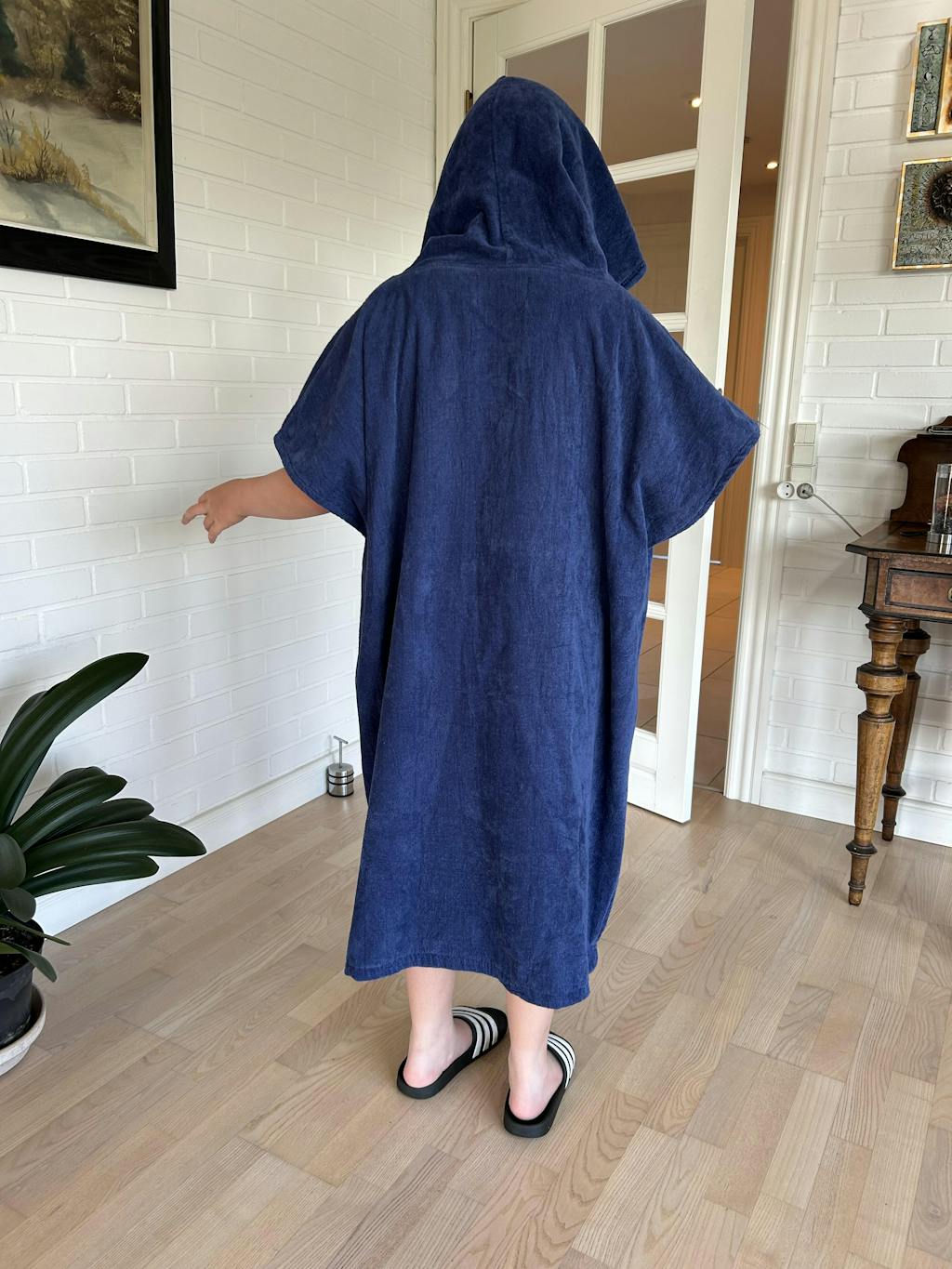 Ponchoen har en stor hætte og smarte åbninger i siden, som gør det nemt at skifte til og fra badetøj.